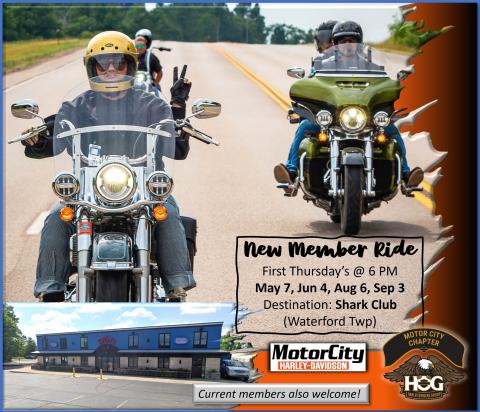 Join us for our New Member Ride, created especially for new chapter members and riders who may have little or no group‑riding experience. This relaxed, supportive ride will take us from the dealership to the Shark Club in Waterford Township for dinner and socializing.